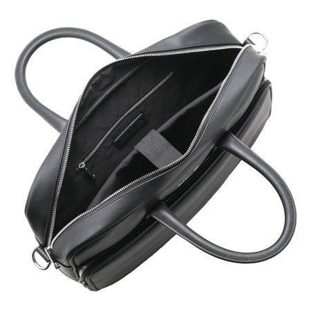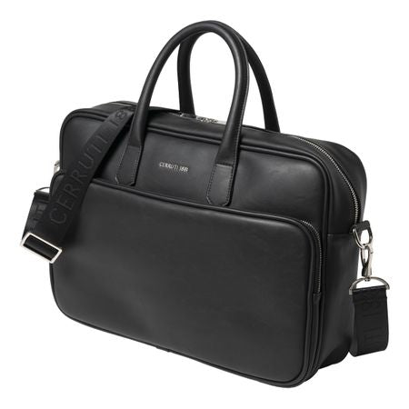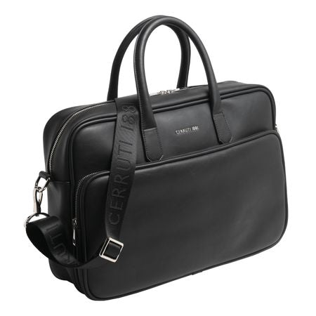Le porte-documents "Zoom", au design minimaliste et à l'allure contemporaine, est fait d'un matériau noir lisse et léger avec une signature en métal chromé brillant. 1 grande poche extérieure, 1 petite poche zippée intérieure et une protection laptop. Doublure intérieure en coton. Poids : 960 g - Dimensions : 400 x 100 x 270 mm. Livré dans son élégant sac coton sable Cerruti 1881